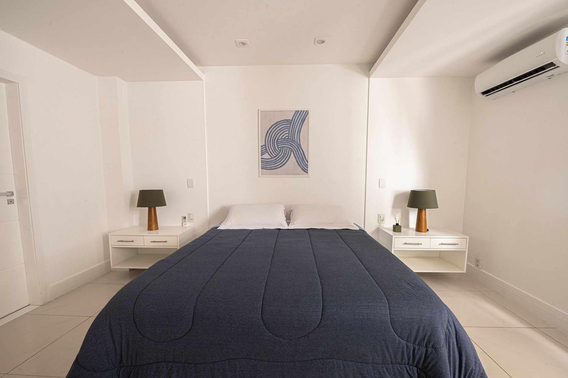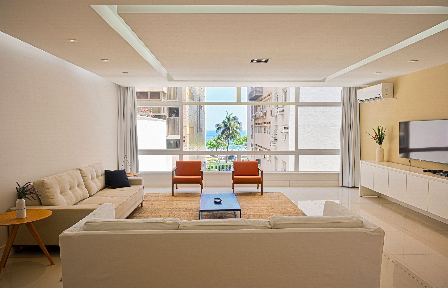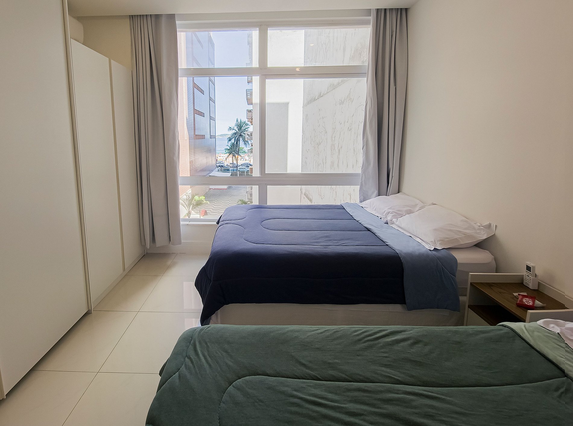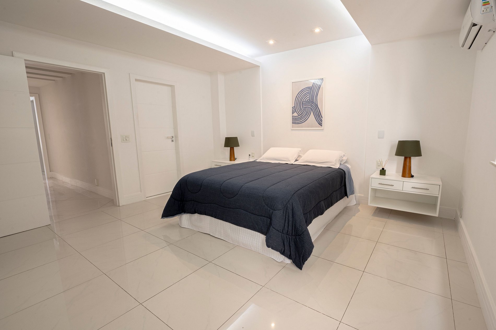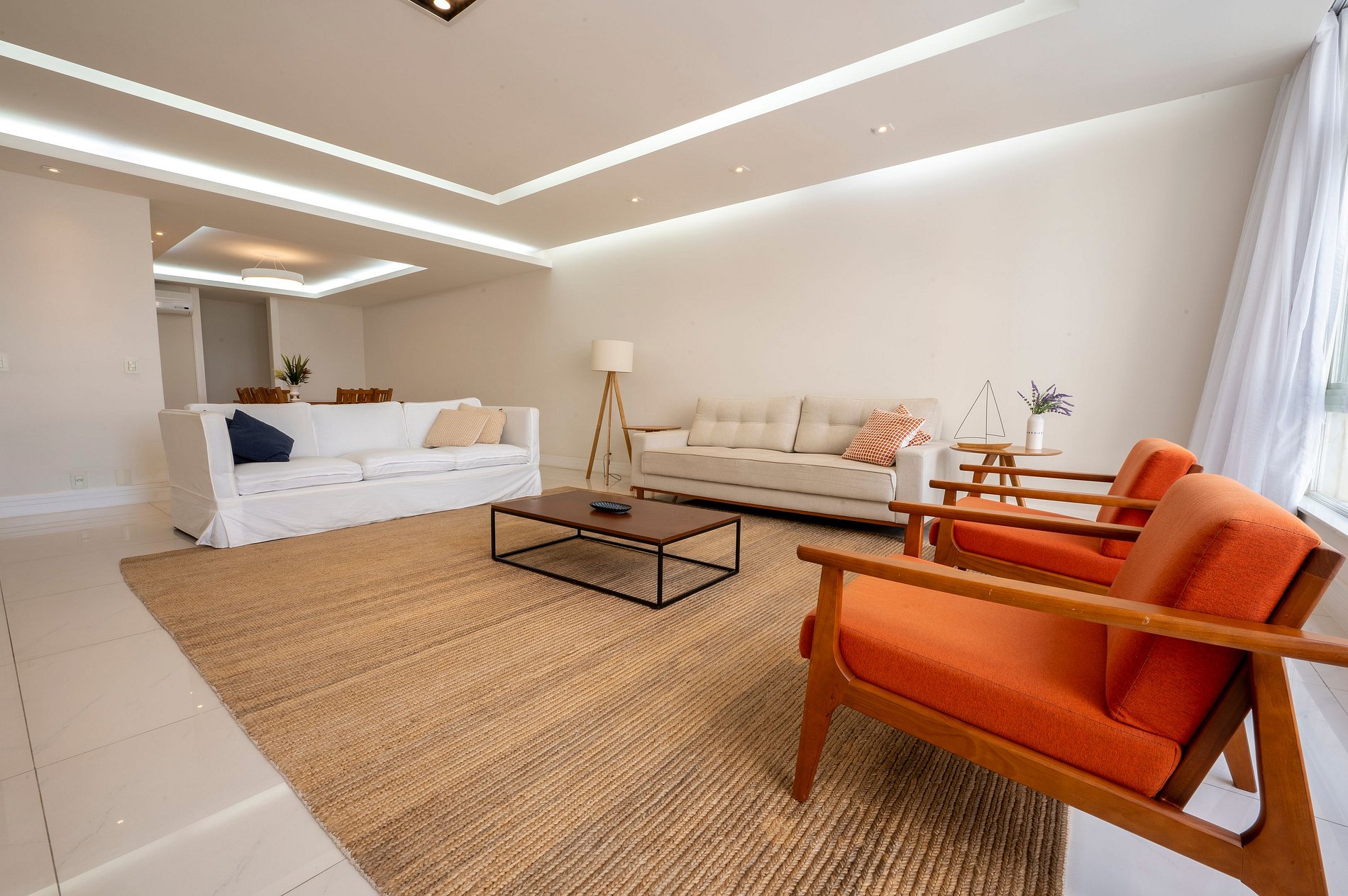 Suite 1 -Ampla suíte -Banheiro completo com chuveiro e ducha higiênica -Cama queen -Ar-Condicionado -Cortina blackout -Amplo Closet Suíte 2 -1 cama de casal -2 camas de solteiro(podendo virar 1 cama queen se solicitado) -Banheiro completo com chuveiro e ducha higiênica -Ar-condicionado -Cortina blackout -Vista Mar -Armários e cabideiros Sala -Ampla mesa de jantar com 8 lugares -Ar condicionado -Smart TV -Maquina nespresso -1 sofa cama( queen) -A Cortina blackout deixa a sala bastante escura para os hóspedes dormirem tranquilos. -1 sofa -2 poltronas