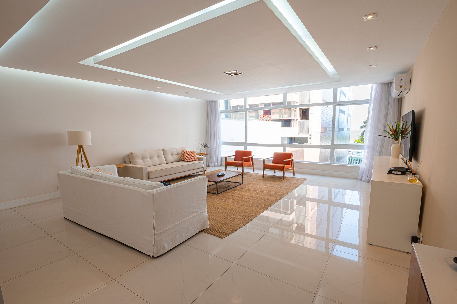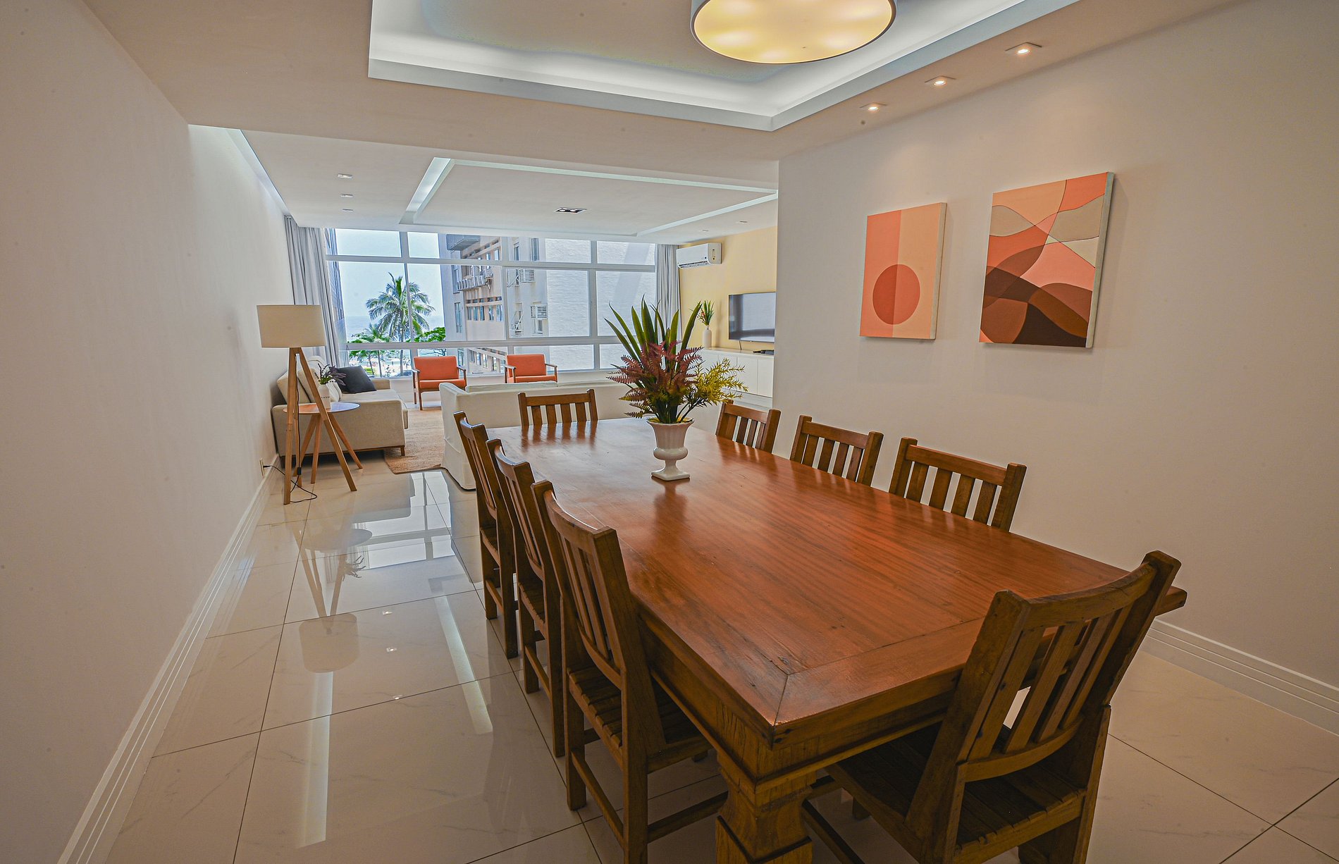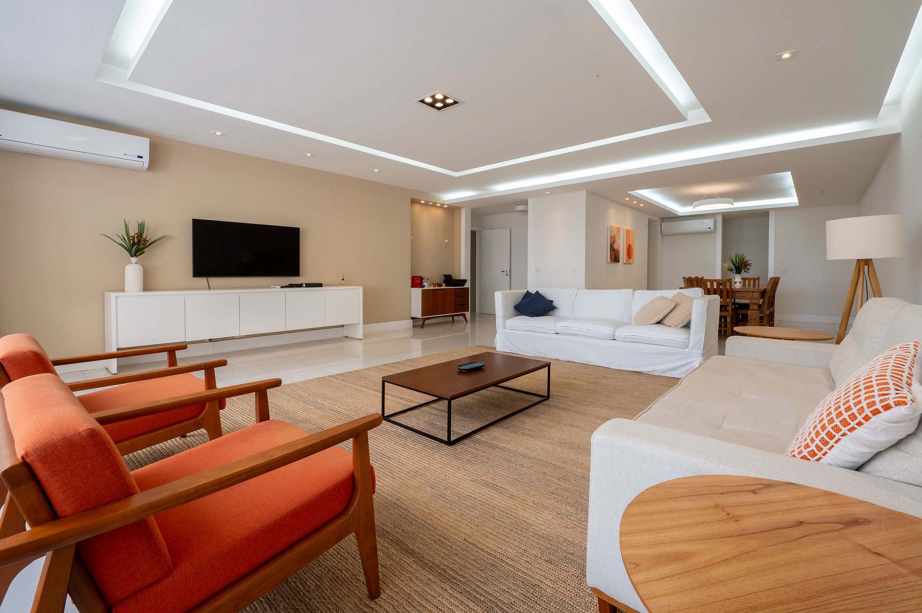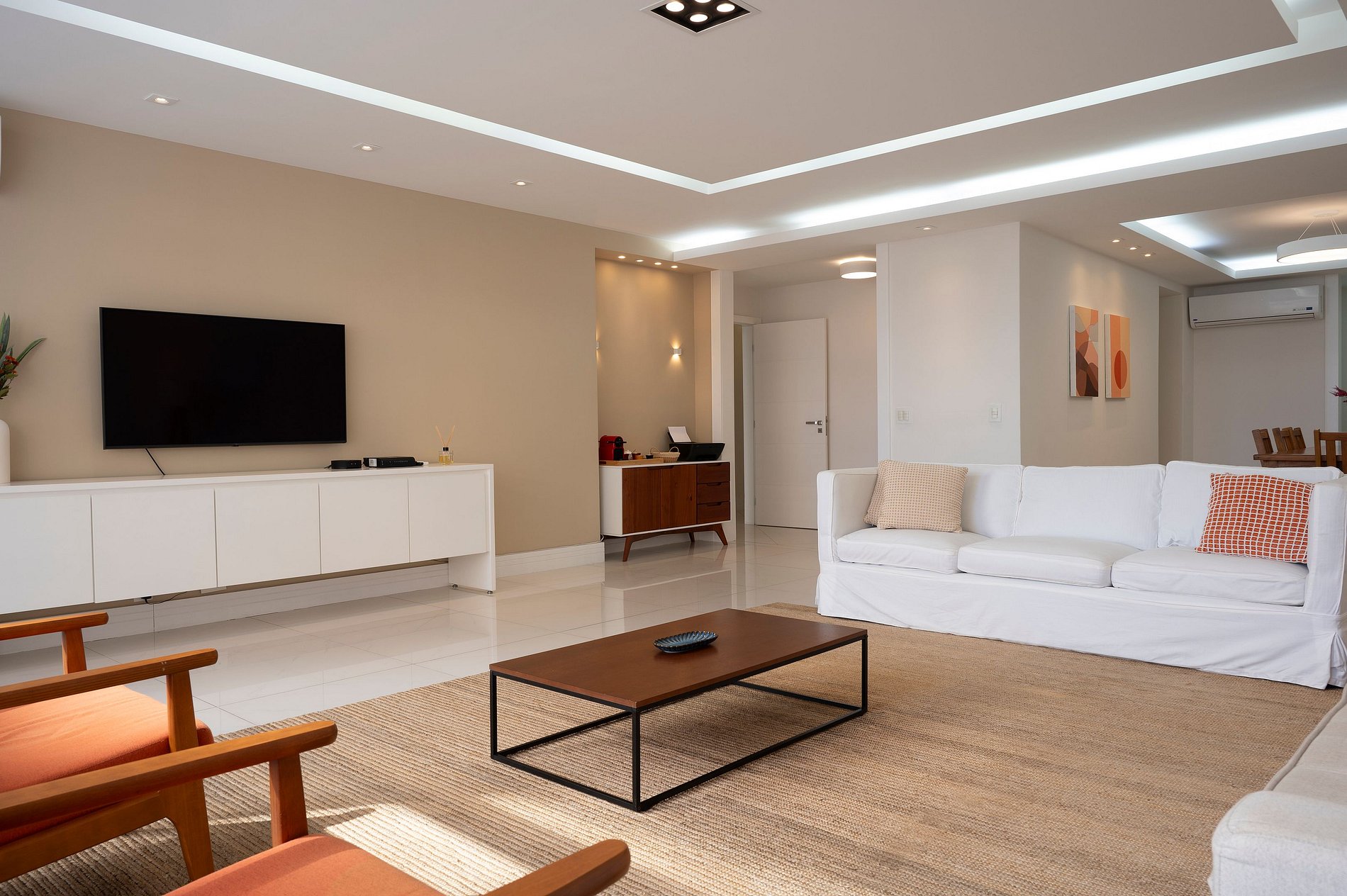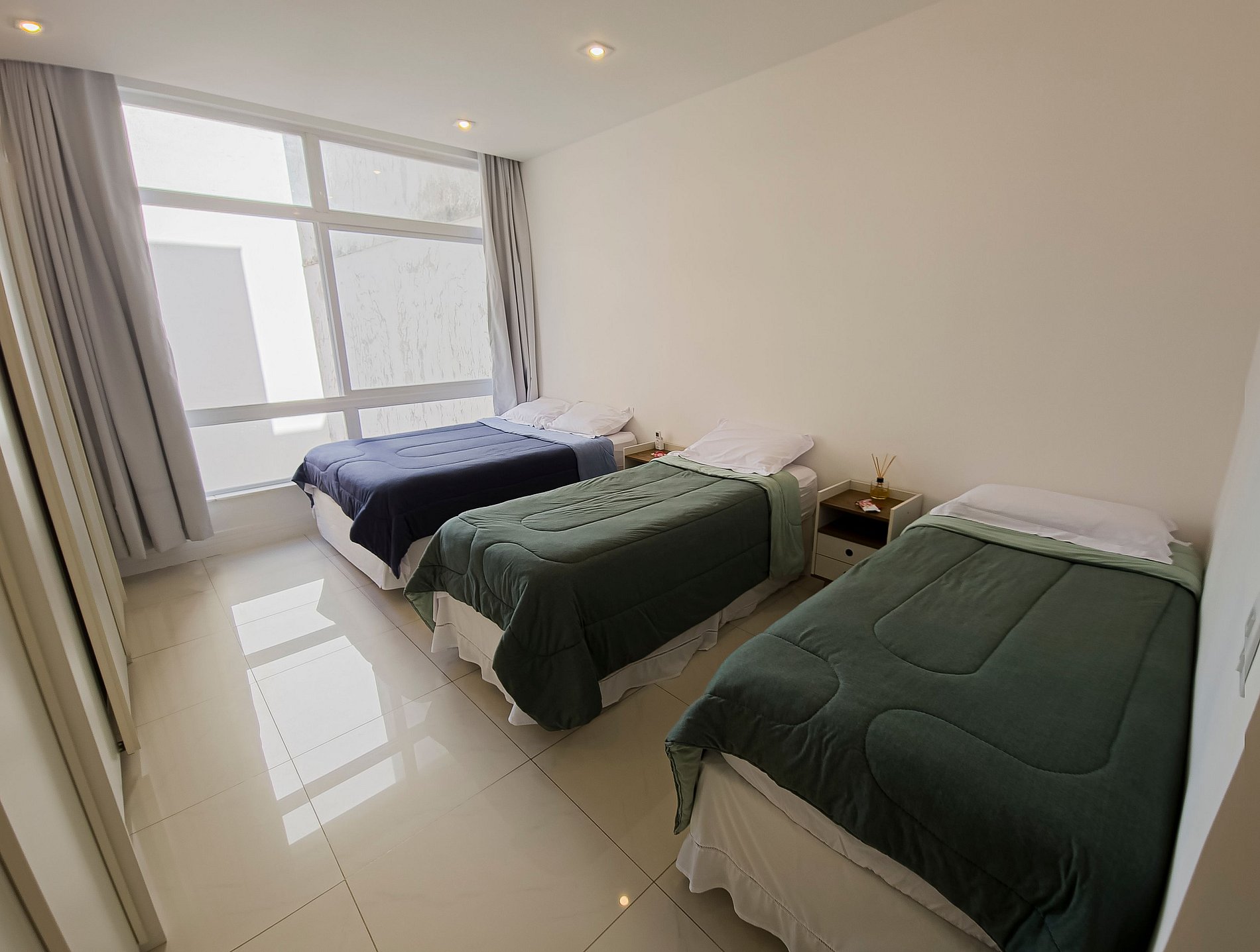 Suite 1 -Ampla suíte -Banheiro completo com chuveiro e ducha higiênica -Cama queen -Ar-Condicionado -Cortina blackout -Amplo Closet Suíte 2 -1 cama de casal -2 camas de solteiro(podendo virar 1 cama queen se solicitado) -Banheiro completo com chuveiro e ducha higiênica -Ar-condicionado -Cortina blackout -Vista Mar -Armários e cabideiros Sala -Ampla mesa de jantar com 8 lugares -Ar condicionado -Smart TV -Maquina nespresso -1 sofa cama( queen) -A Cortina blackout deixa a sala bastante escura para os hóspedes dormirem tranquilos. -1 sofa -2 poltronas