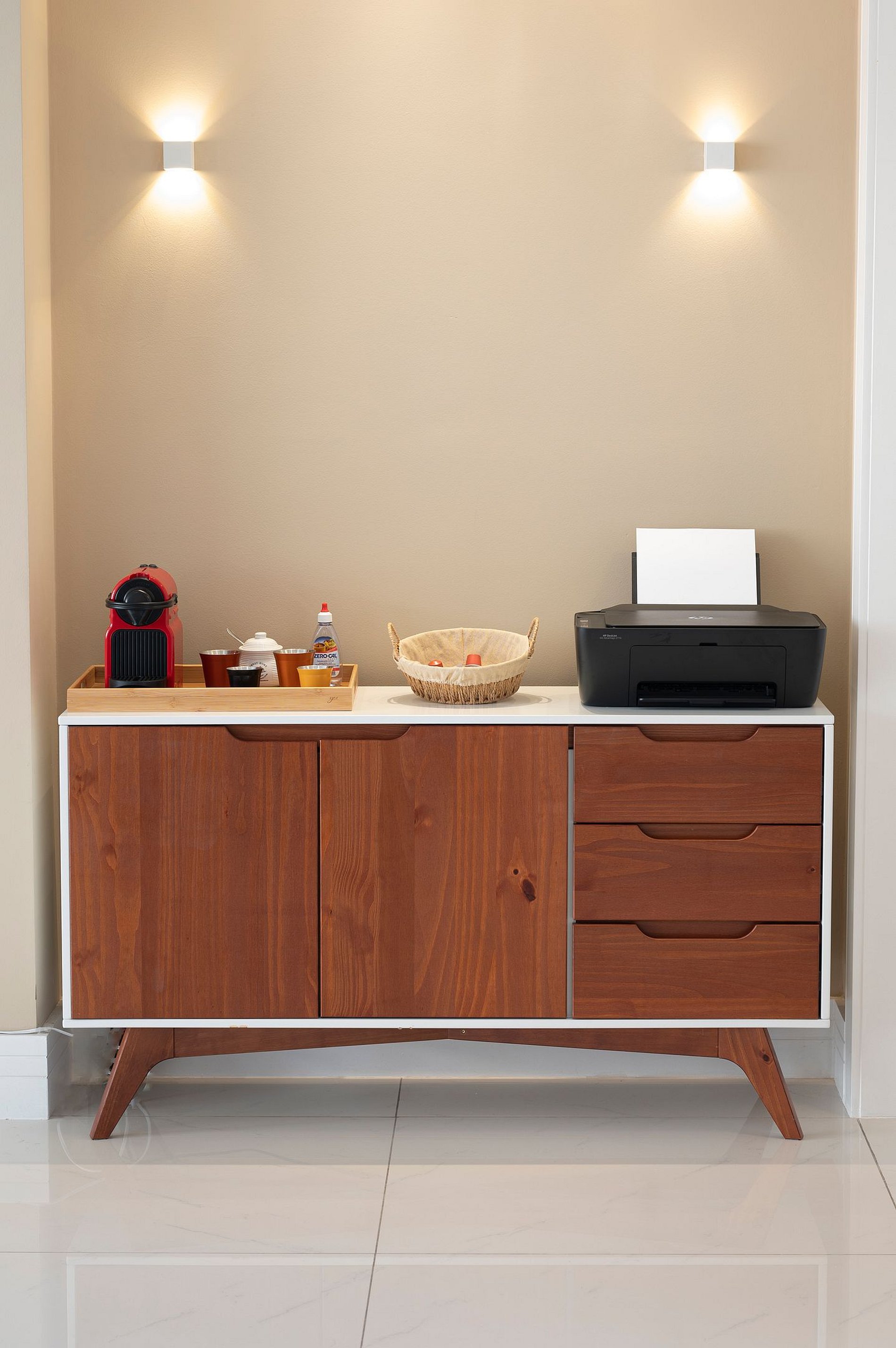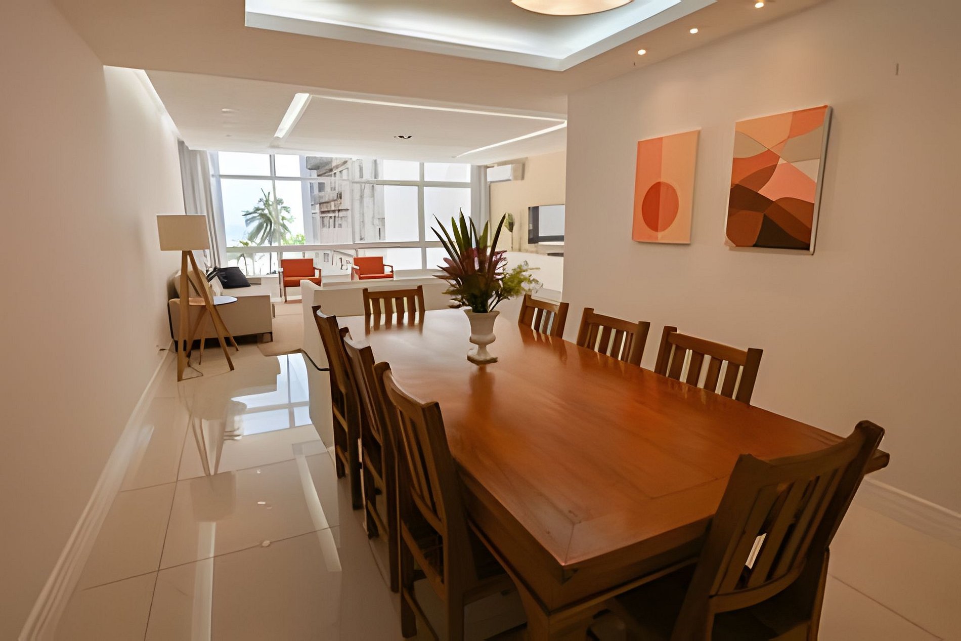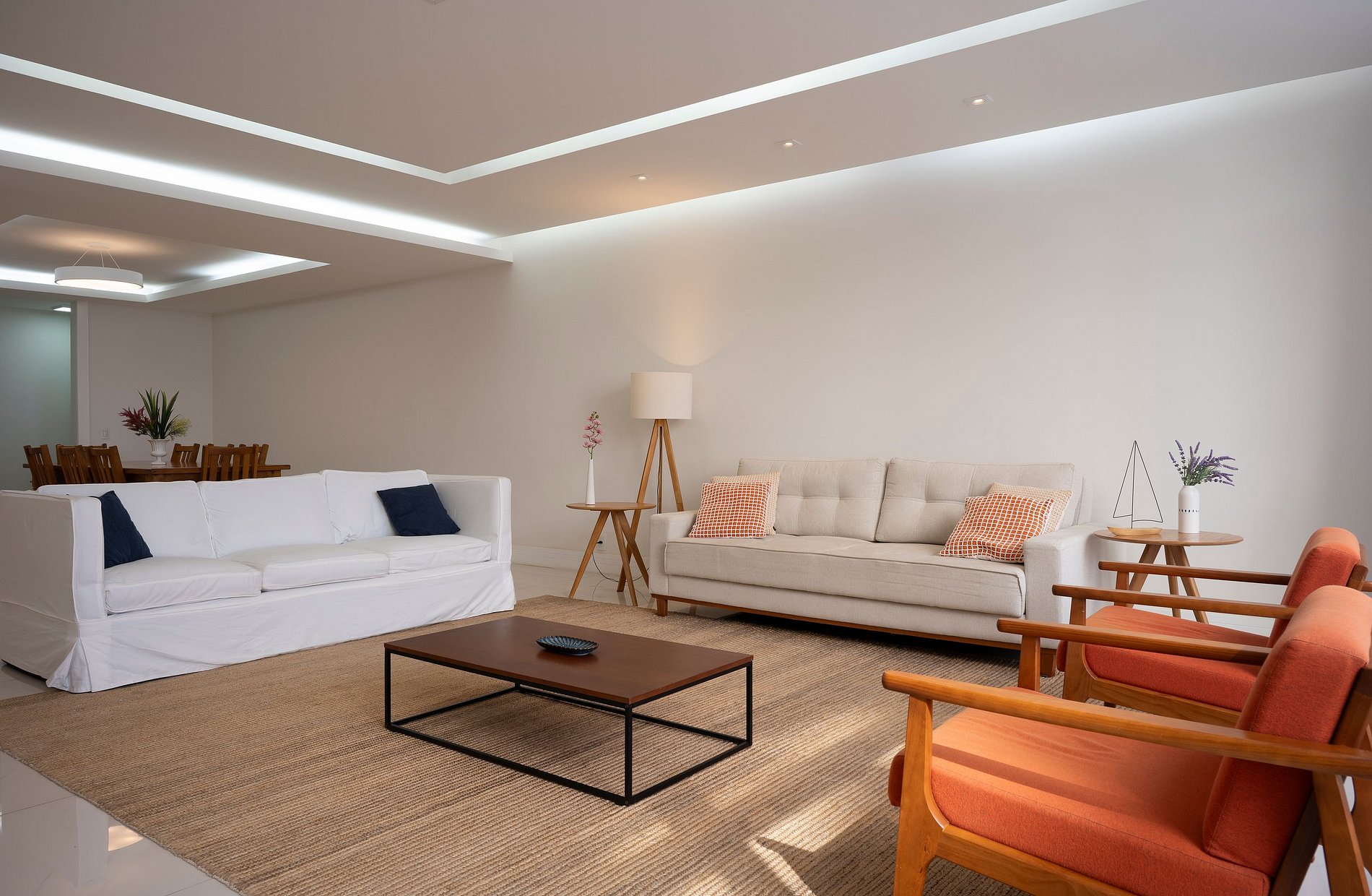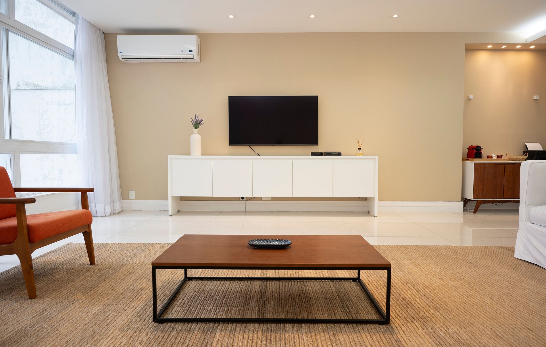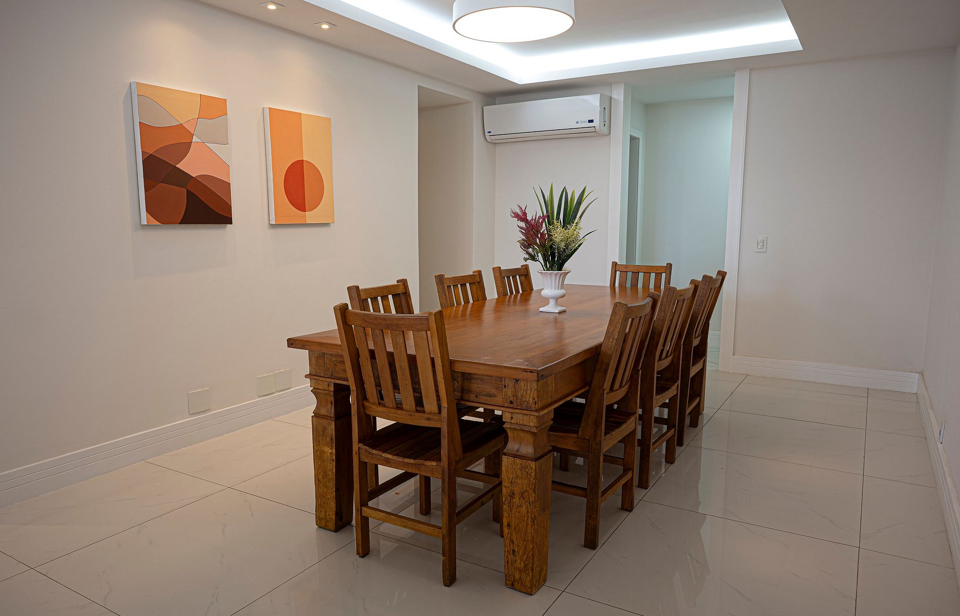 Suite 1 -Ampla suíte -Banheiro completo com chuveiro e ducha higiênica -Cama queen -Ar-Condicionado -Cortina blackout -Amplo Closet Suíte 2 -1 cama de casal -2 camas de solteiro(podendo virar 1 cama queen se solicitado) -Banheiro completo com chuveiro e ducha higiênica -Ar-condicionado -Cortina blackout -Vista Mar -Armários e cabideiros Sala -Ampla mesa de jantar com 8 lugares -Ar condicionado -Smart TV -Maquina nespresso -1 sofa cama( queen) -A Cortina blackout deixa a sala bastante escura para os hóspedes dormirem tranquilos. -1 sofa -2 poltronas