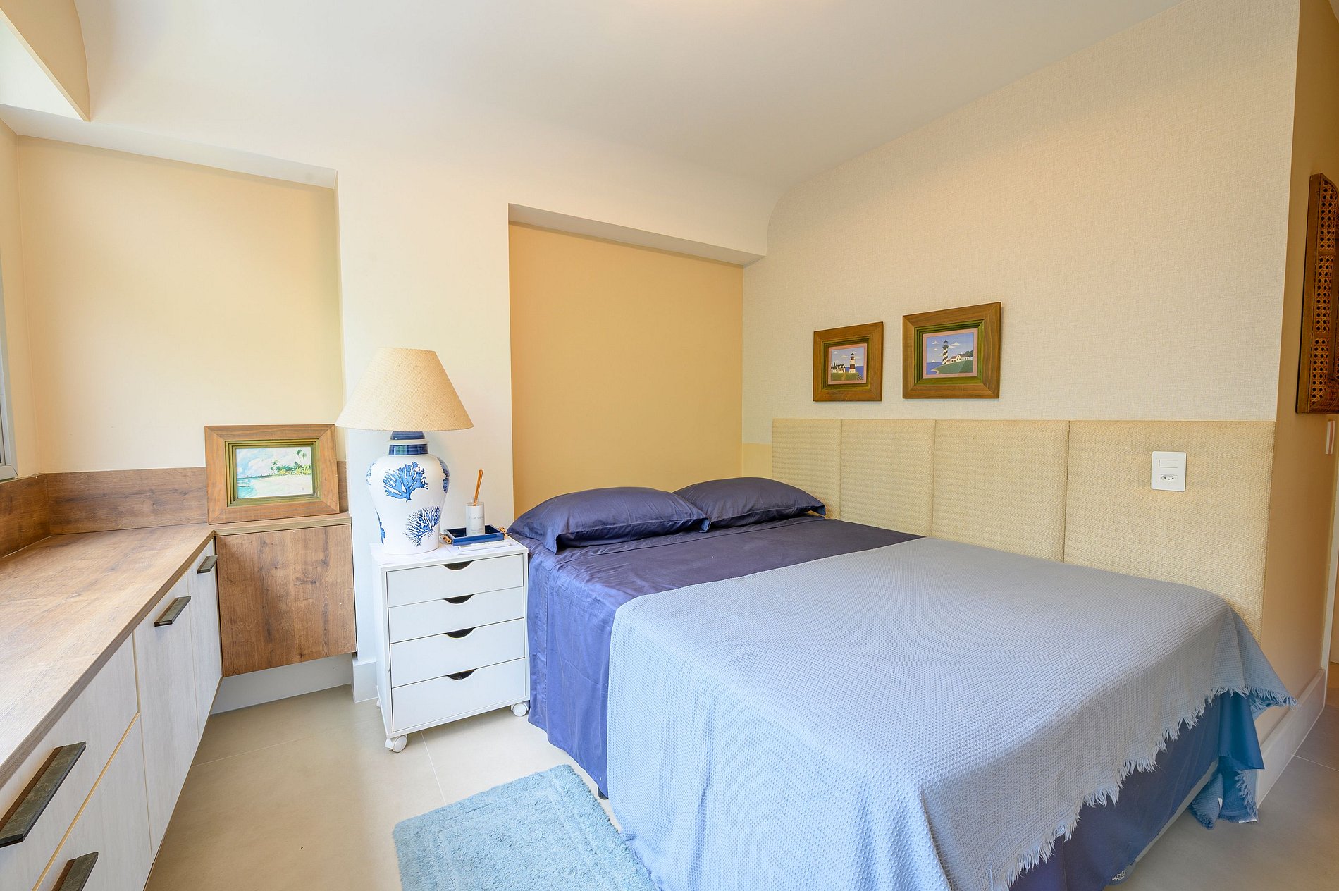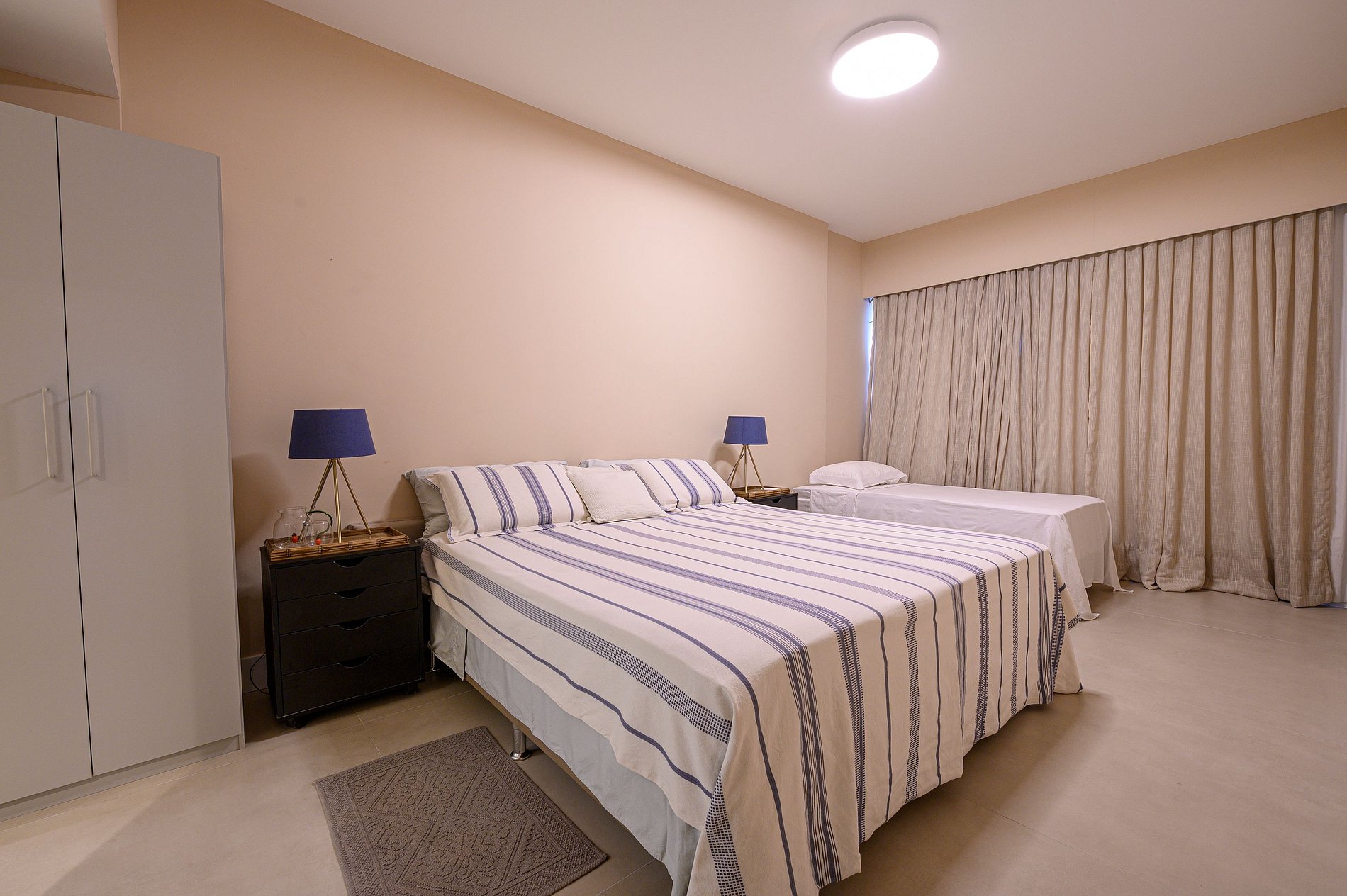 Suíte Master : Cama King-size, complementada por uma cama de solteiro, com possibilidade de reconfiguração conforme a necessidade — ideal para famílias.