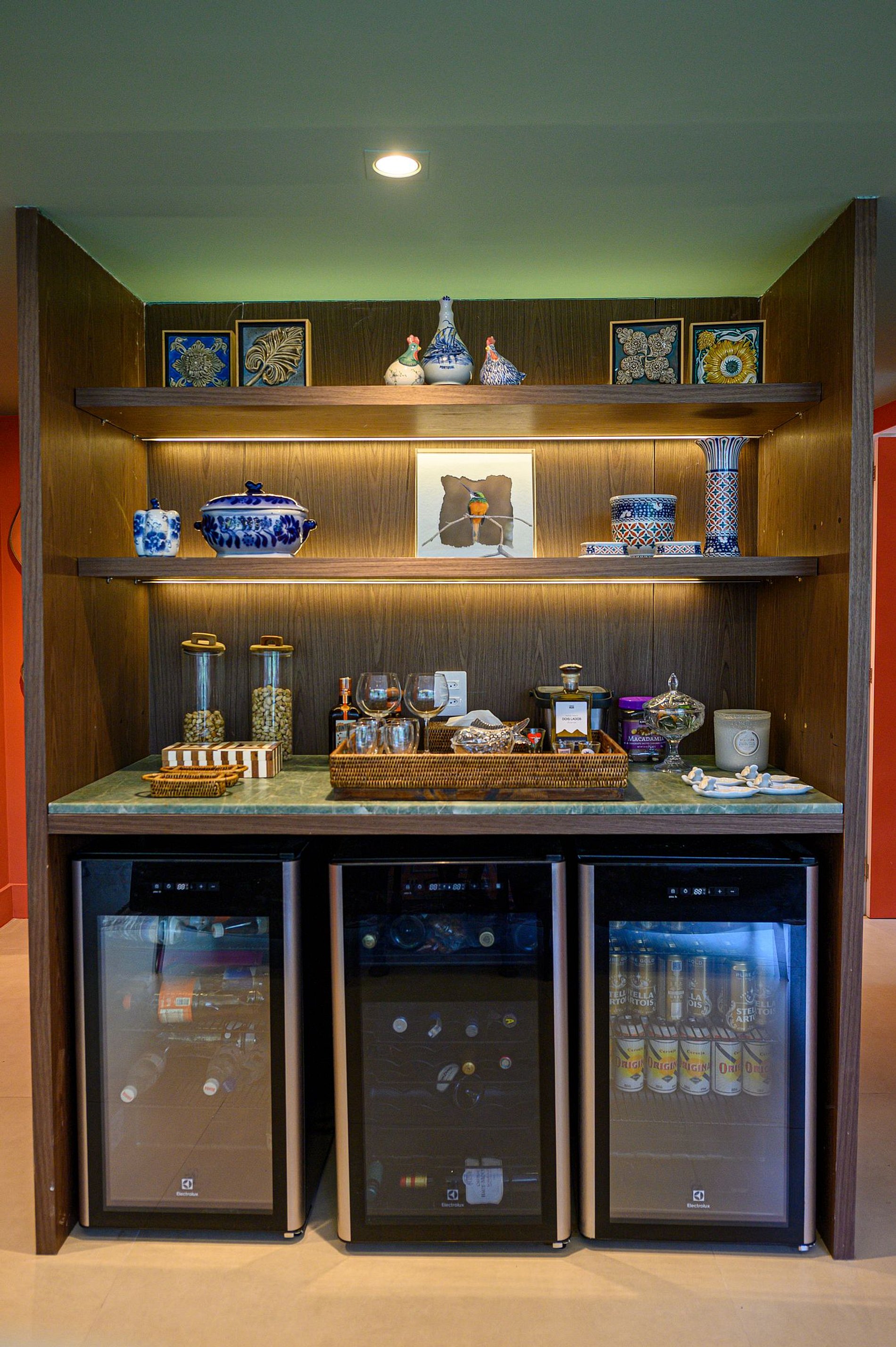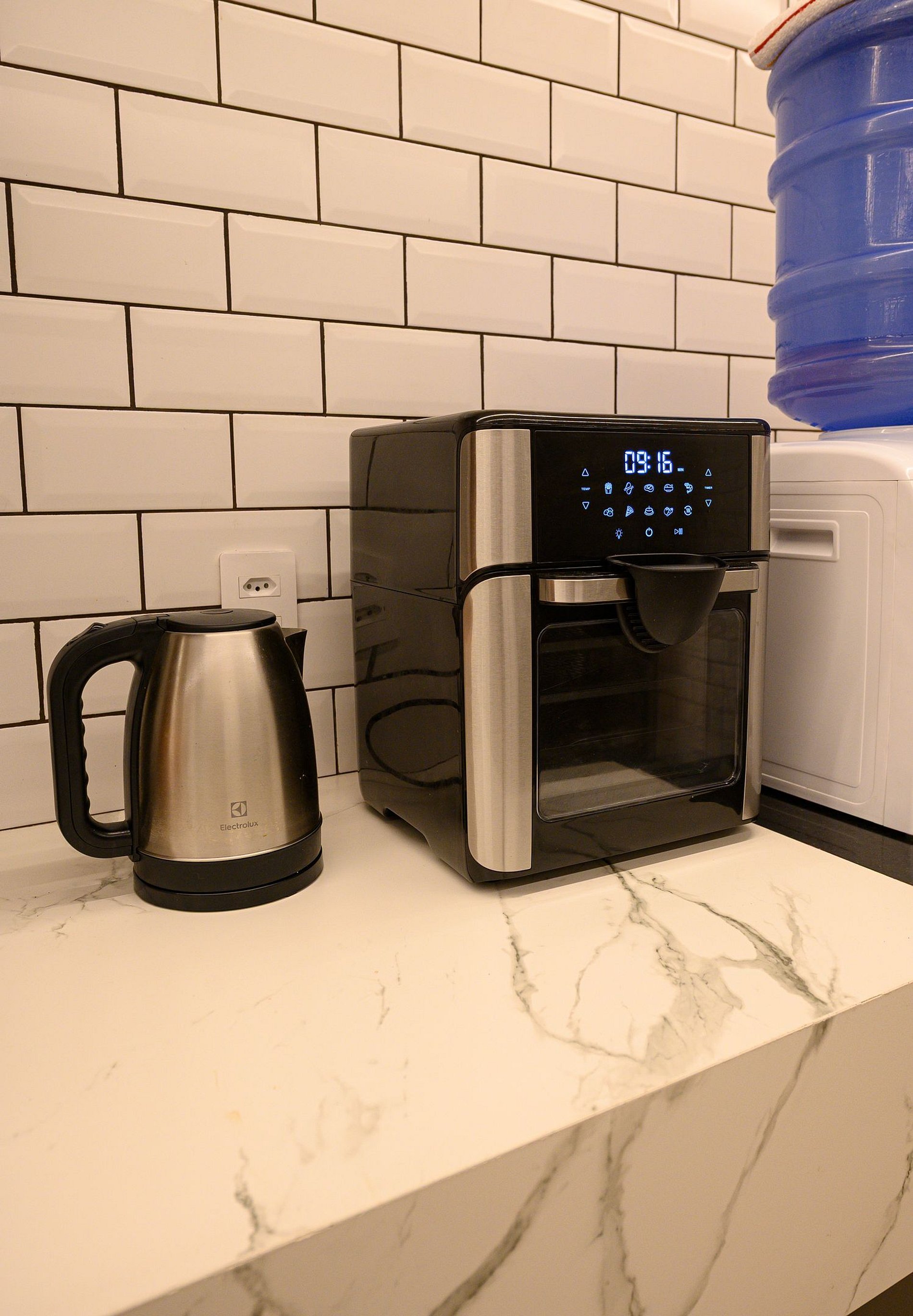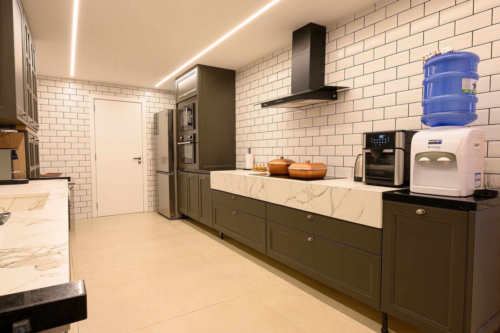 A cozinha é ampla e totalmente equipada, contando com geladeira, fogão, forno, air fryer, chaleira elétrica e lava-louças, além de cafeteira Nespresso, cervejeira e duas adegas climatizadas para vinhos, atendendo aos mais altos padrões de conveniência.