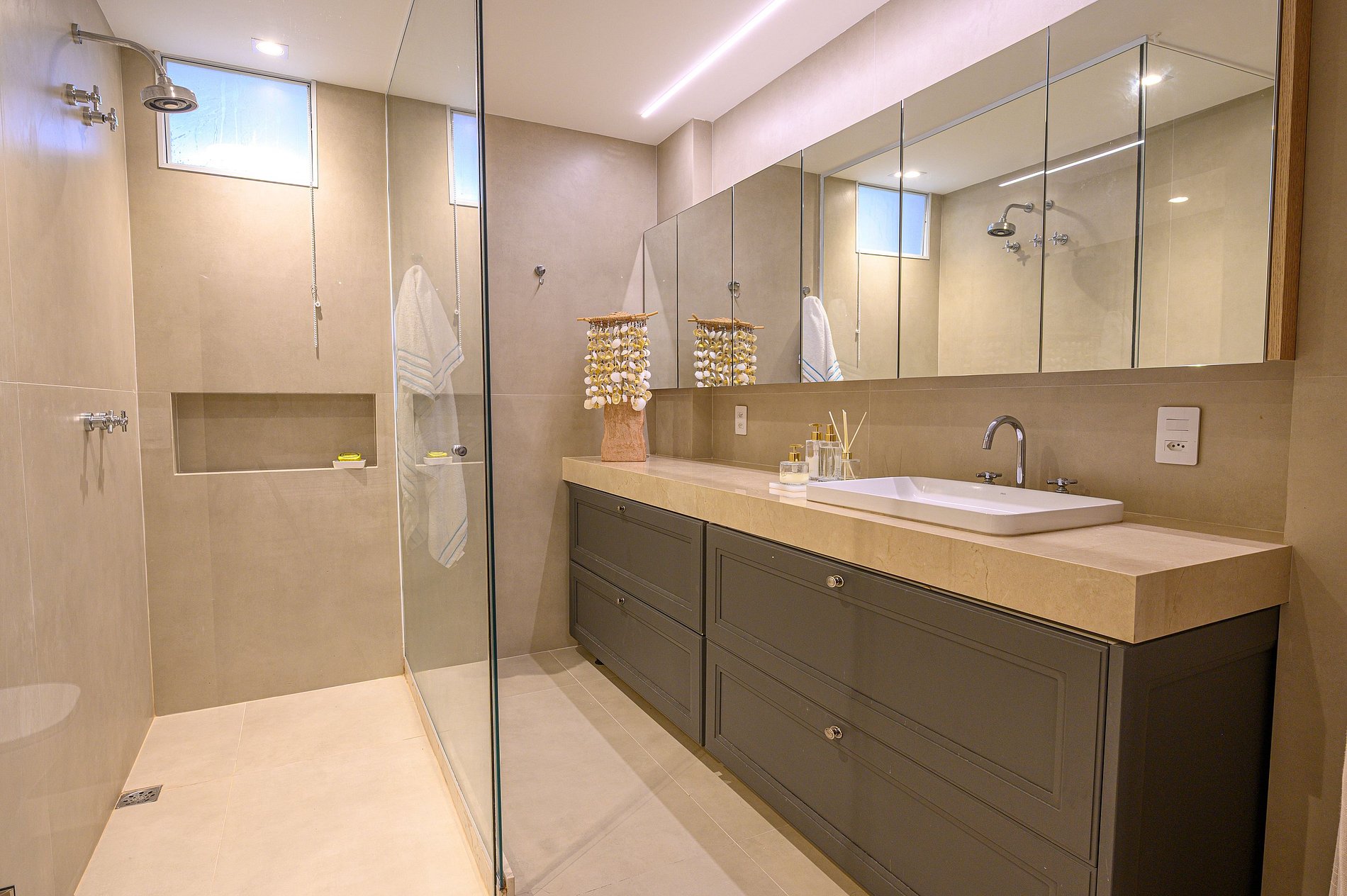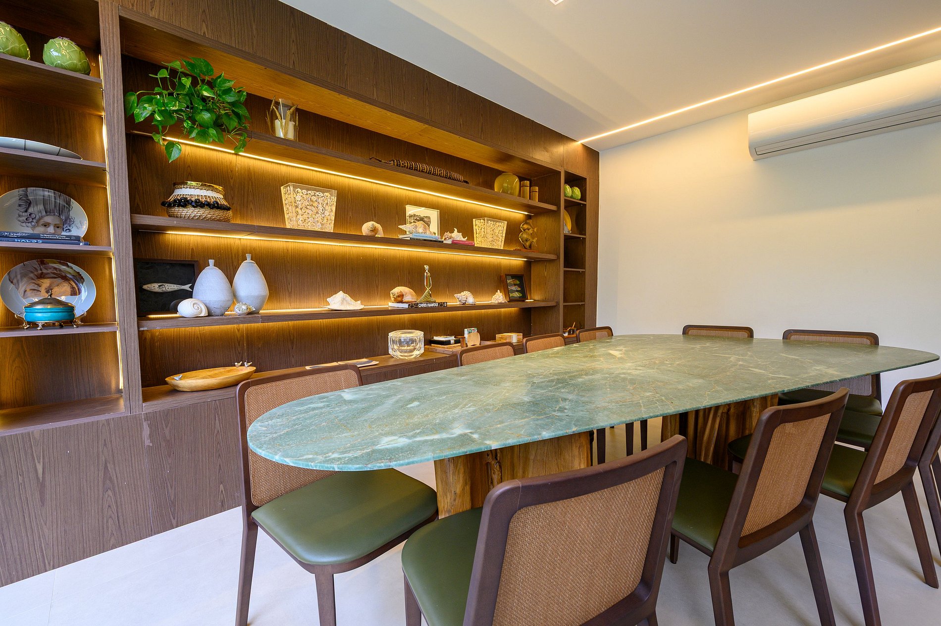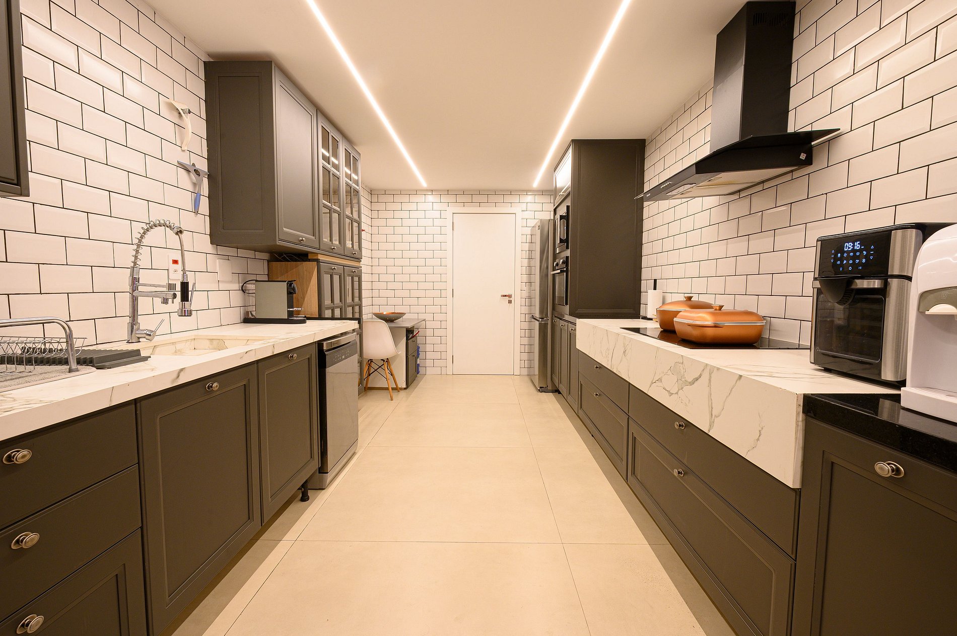 A cozinha é ampla e totalmente equipada, contando com geladeira, fogão, forno, air fryer, chaleira elétrica e lava-louças, além de cafeteira Nespresso, cervejeira e duas adegas climatizadas para vinhos, atendendo aos mais altos padrões de conveniência.