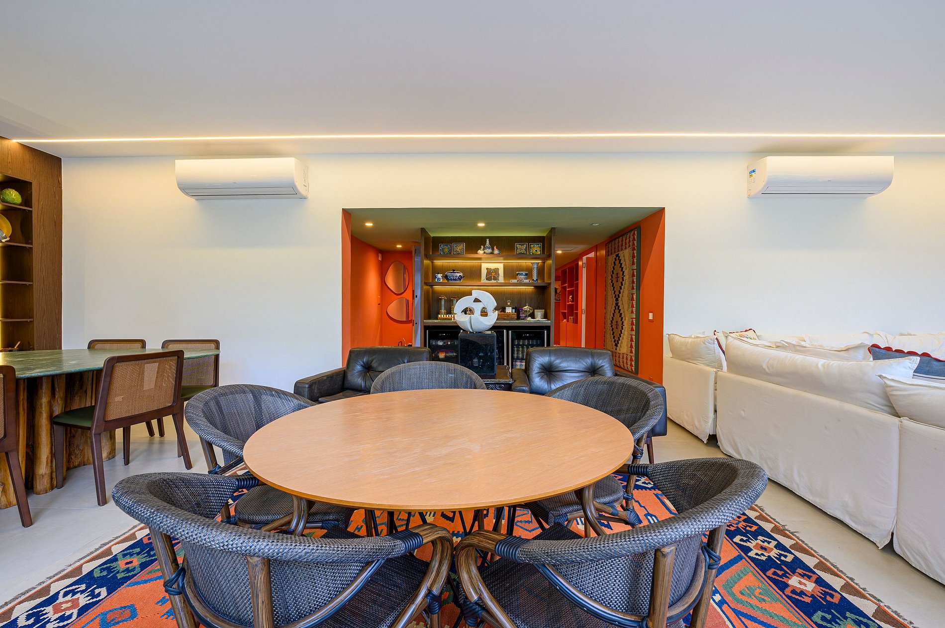 A sala de estar e jantar integrada é ampla e confortável, equipada com sofás e poltronas de alto padrão, mesa de jantar para até 10 pessoas, ar-condicionado, Smart TV de 55” e cortinas com controle remoto, oferecendo um ambiente ideal para convivência e relaxamento.