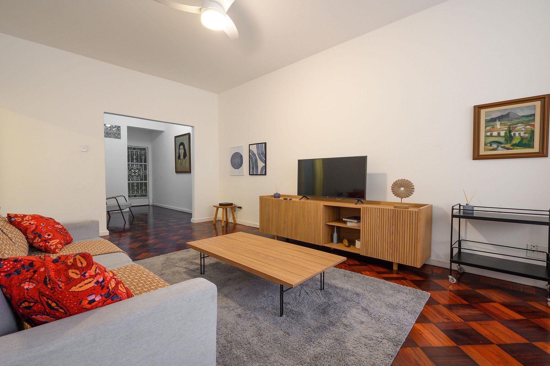 Sala ampla e bem iluminada, mesa na sala de jantar para 6 lugares e espaço para leitura.