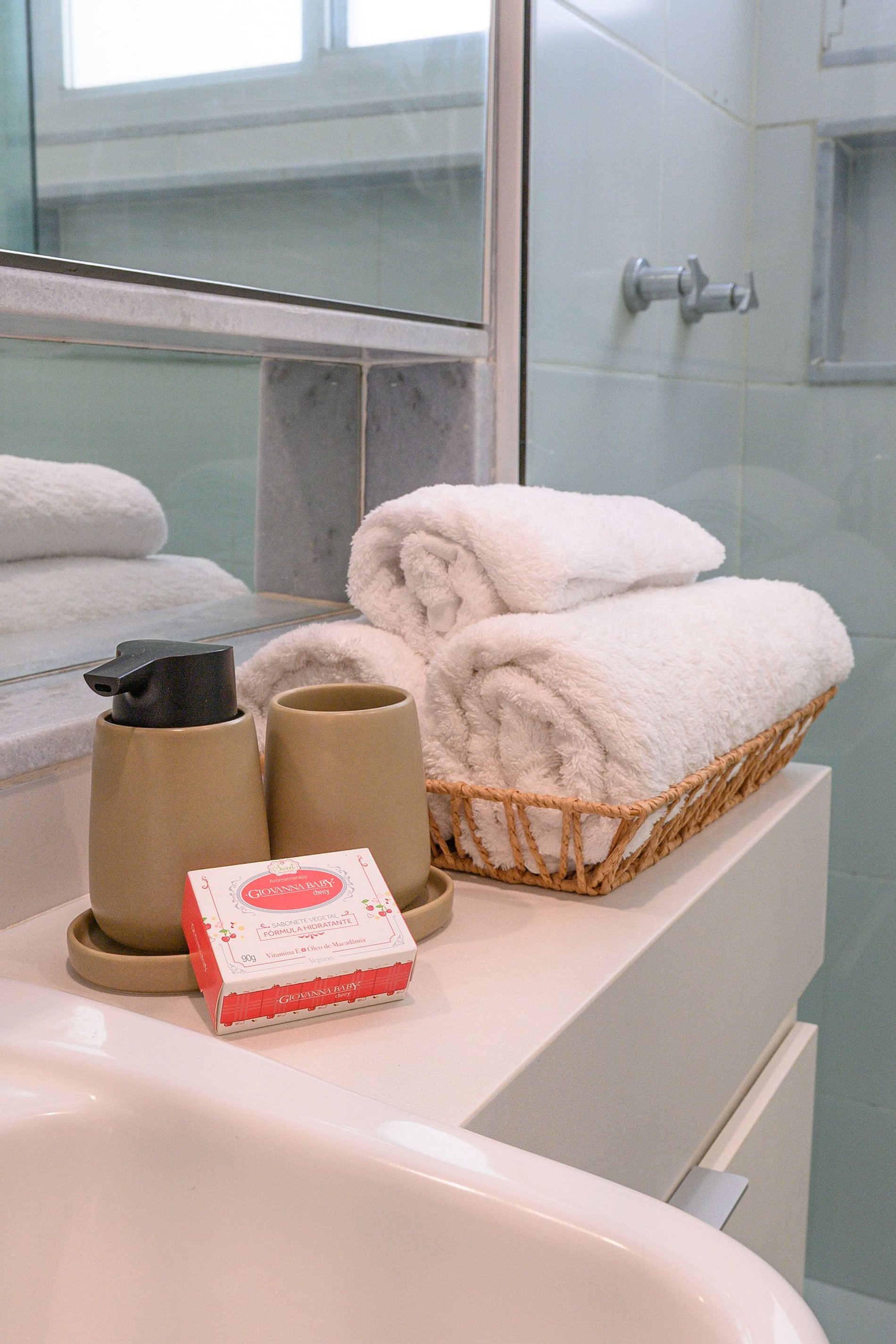 Roupa de cama de ótima qualidade, toalhas , sabonete para o corpo e para as mãos.